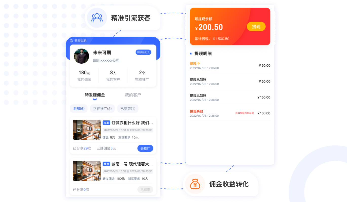 精準引流,客戶軌跡追蹤推送、深度洞察客戶需求。 快速鎖客,直接對話消息及時提醒,增加量房量為銷售賦能。