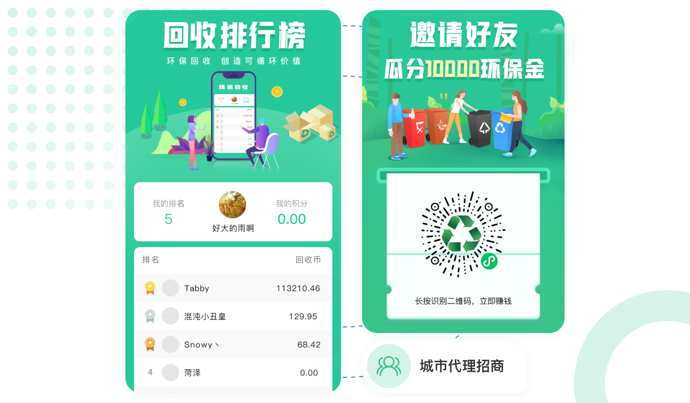 麥芒環保回收解決方案:用戶通過小程序下單、系統自動分單、回收員上門回收、線上結算打款等幫助回收行業互聯網+,實現廢品回收數互聯網轉型,為環保事業做貢獻。